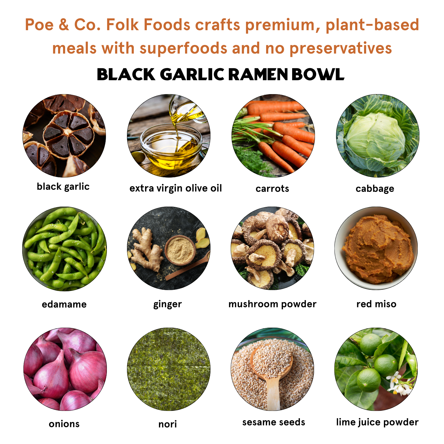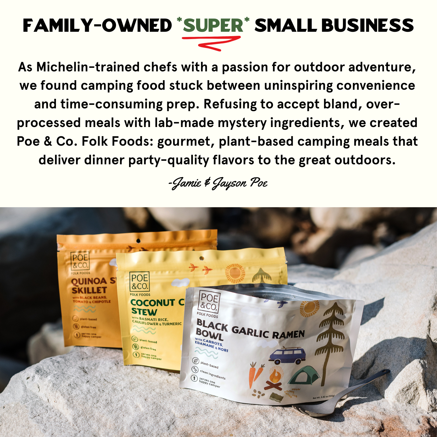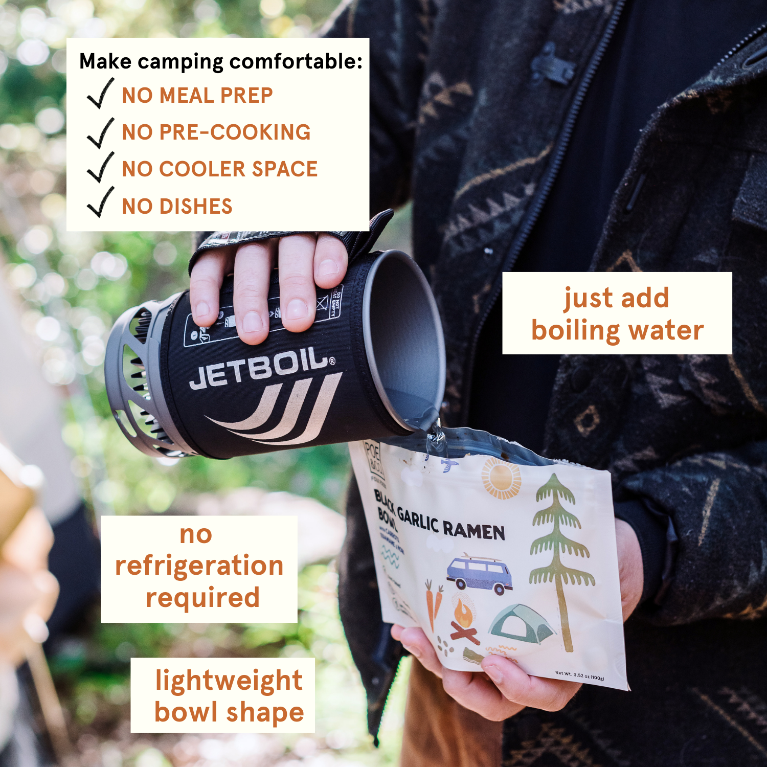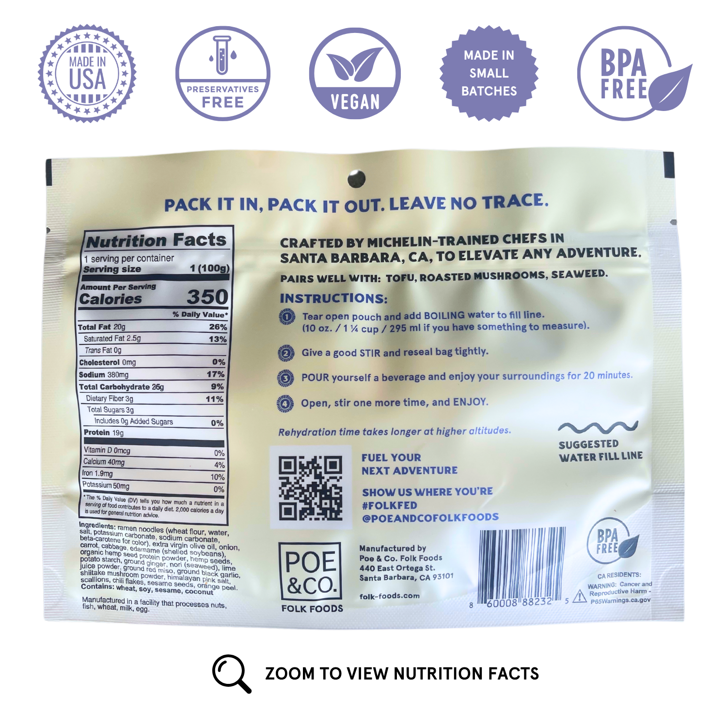 A modern, chef-inspired take on ramen — rich black garlic–miso broth, loaded with veggies, and easy-to-eat noodles. Just add hot water for a nourishing, flavor-packed bowl designed to fuel your adventure. Clean fuel for the trail, small-batch and chef-made with simple ingredients. 3-year shelf life.
