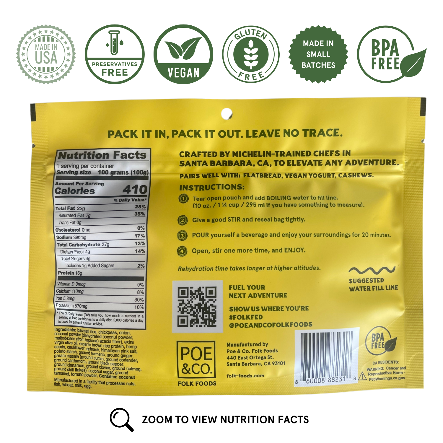 - Ingredients: basmati rice, chickpeas, onion, coconut powder (dehydrated coconut powder, maltodextrin (from tapioca) acacia fiber), extra virgin olive oil, organic brown rice protein, hemp seeds, cauliflower, spinach, himalayan pink salt, potato starch, ground turmeric, ground ginger, garam masala (ground cumin, ground coriander, ground cardamom, ground black pepper, ground cinnamon, ground cloves, ground nutmeg, ground chili flakes), coconut sugar, ground tamarind, tomato powder.